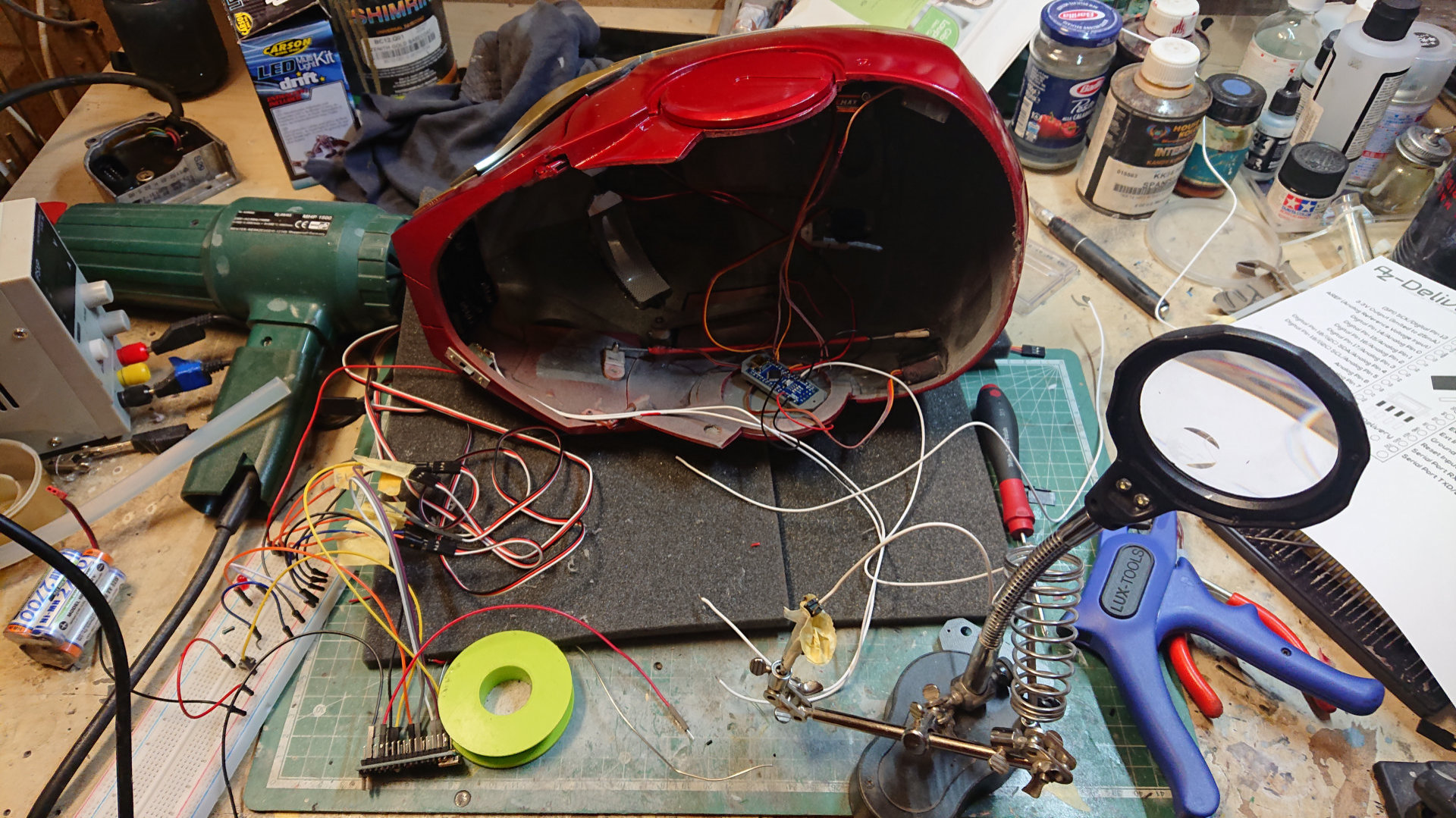 Das ist mein gedruckter Iron Man Helm. Gedruckt habe ich ihn aus PLA auf meinem Creality CR10 V2.Mit insgesamt vier Mikro-Servos und einem Arduino habe ich ihn auch motorisiert.Das ist der Arduino code:const int servo1Pin = 6;const int buttonPin = 2;const int LEDPin = 5;const int servo2Pin = 9;const int Servo3Pin = 10;const int Servo4Pin = 11;int pos = 0;int pos1 = 180;int pos2 = 90;#include <Servo.h>Servo visorServo1;Servo visorServo2;Servo faceServo1;Servo faceServo2;void setup() { visorServo1.write(60); // Initial position visorServo1.attach(servo1Pin); visorServo2.write(140); // initial position visorServo2.attach(servo2Pin); faceServo1.write(145); faceServo1.attach(Servo3Pin); faceServo2.write(40); faceServo2.attach(Servo4Pin); pinMode(buttonPin, INPUT_PULLUP); // Connect button between pin and GROUND. LOW when pushed. pinMode(LEDPin, OUTPUT); digitalWrite(LEDPin, LOW); // LED off}void loop() { static unsigned long lastPushedTime = 0; static boolean visorClosed = true; static boolean lastButtonState = HIGH; boolean newButtonState = digitalRead(buttonPin); // If the button is down and it has been a while since it was last down... if (newButtonState == LOW && lastButtonState == HIGH && millis() - lastPushedTime > 100) { lastPushedTime = millis(); if (visorClosed) { faceServo1.write(55); // Endlage Face geschlossen faceServo2.write(124); // Endlage Face geschlossen delay(300); visorServo1.write(140); // Open visor Endlage Visor bzw Kinn geschlossen visorServo2.write(60); // Open visor Endlage Visor bzw Kinn geschlossen delay(1000); visorClosed = false; digitalWrite(LEDPin, HIGH); // Turn on light } else { // Viso is openvisorServo1.write(60); // Close visor visorServo2.write(140); delay(300); faceServo1.write(155); faceServo2.write(30); visorClosed = true; digitalWrite(LEDPin, LOW); // Turn off light } } lastButtonState = newButtonState;}