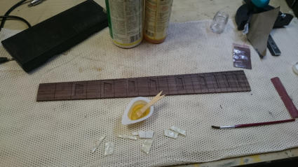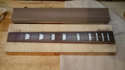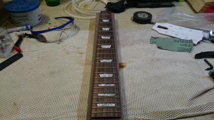 Weiter geht es mit dem Griffbrett. Die Inlays klebe ich wieder mit Epoxydharz ein. Das