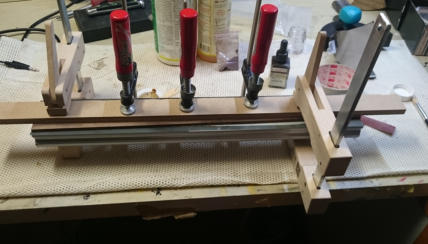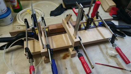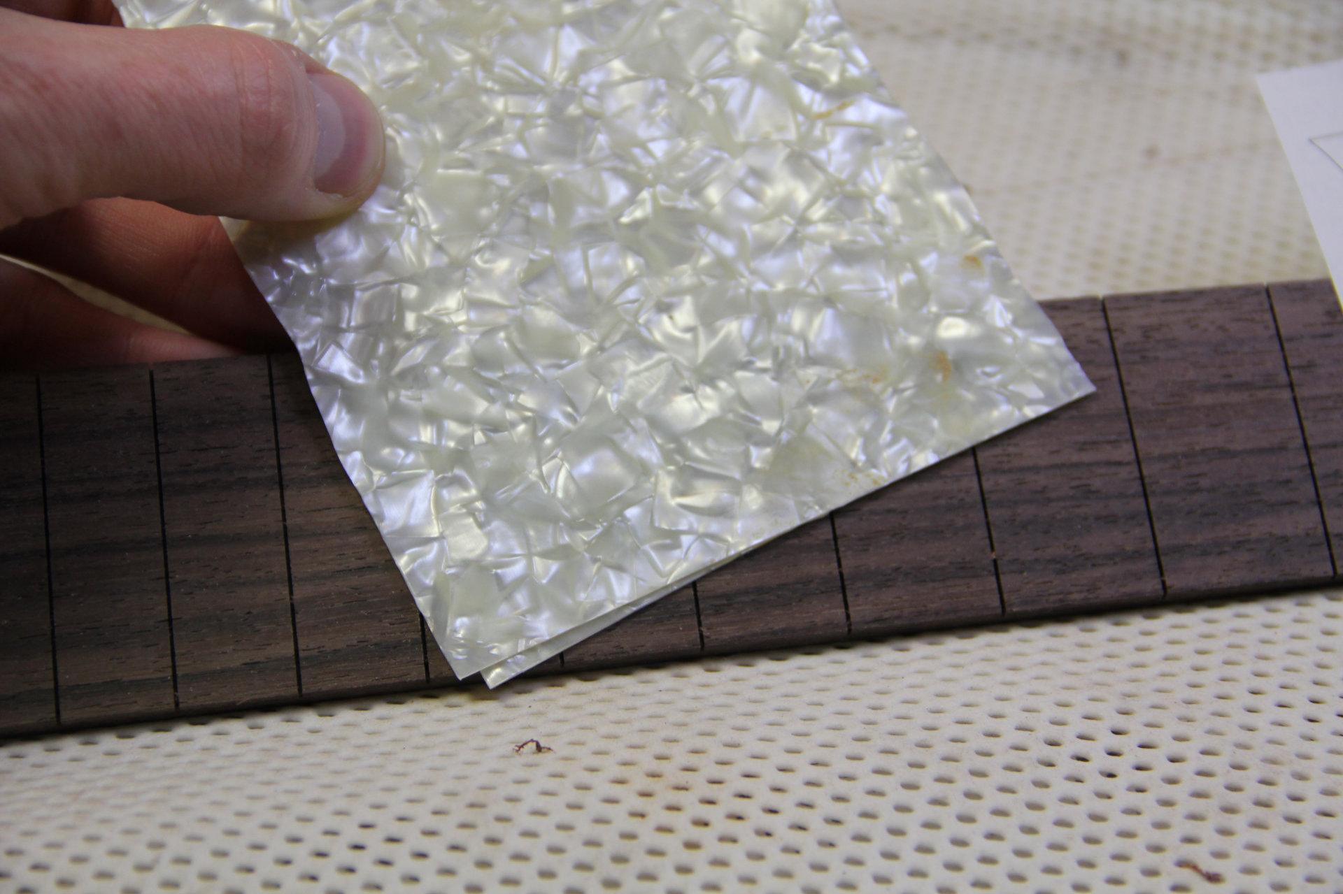 Ich fange schon mal mit den Inlays für das Griffbrett an. Diesmal laminiere ich das