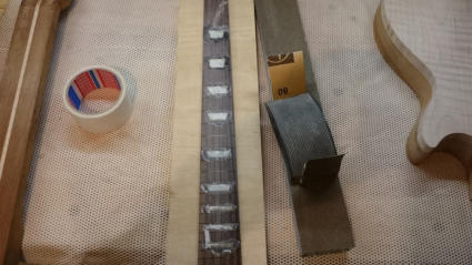 Nachtrag: Besser das Griffbrett ohne Bünde und ohne Binding auf den noch nicht ausgearbeiteten Hals leimen.