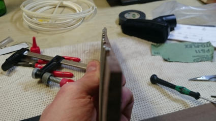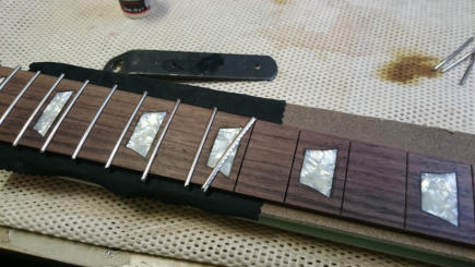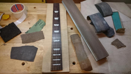 Nach dem Bundieren ist das Griffbrett krumm wie eine Banane... Egal. Ich gehe davon
