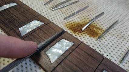 Die Bundschlitze betupfe ich vor dem Einschlagen der Bünde mit Sekundenkleber.