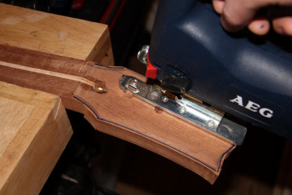 Per Oberfräse und 4mm Radiusfräser den Korpus hinten abgerundet.