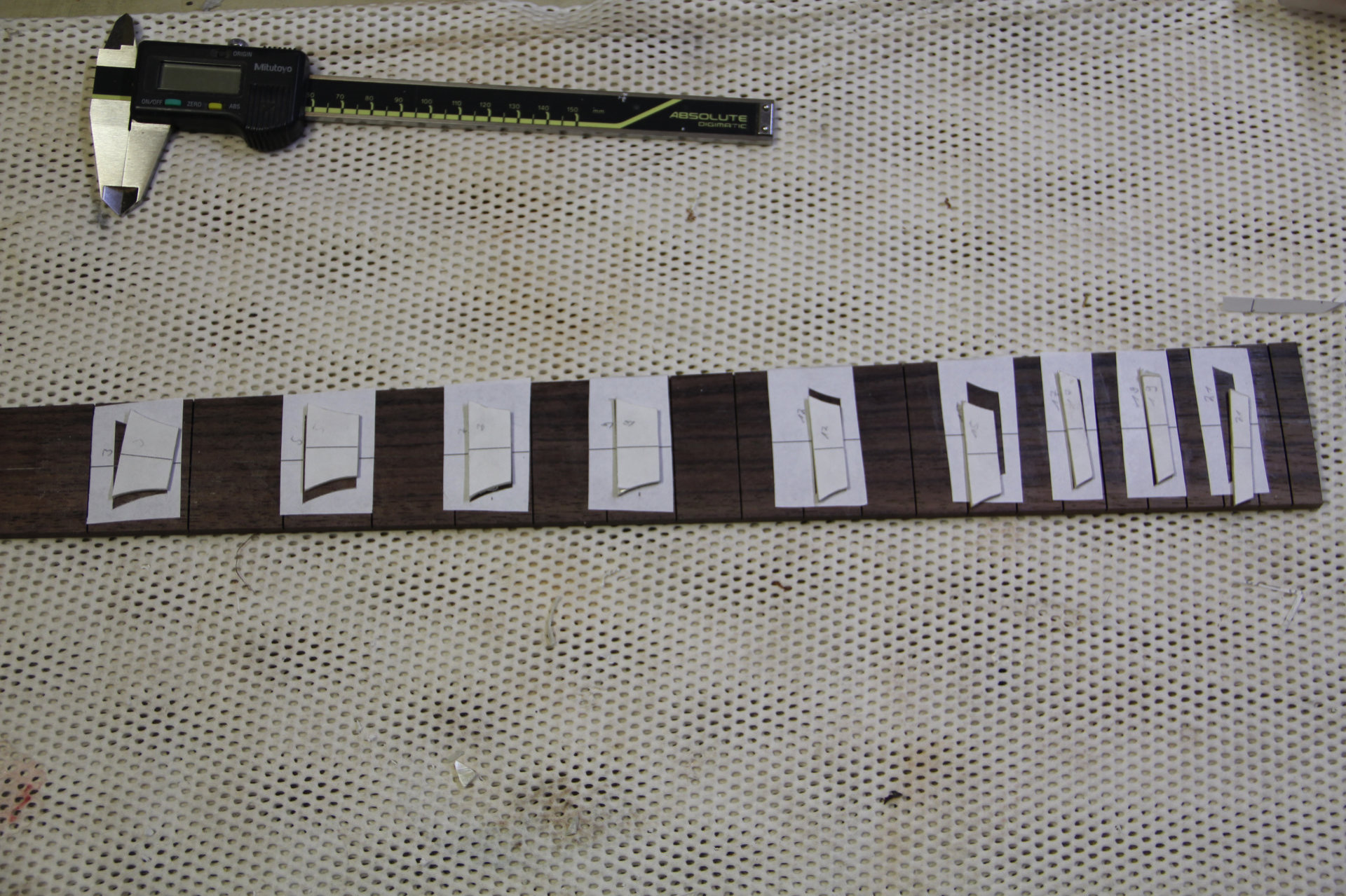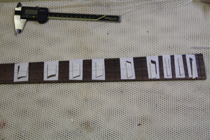 auf das Griffbrett. Zum leichteren Ausrichten habe ich Griffbrett und Papierschablonen