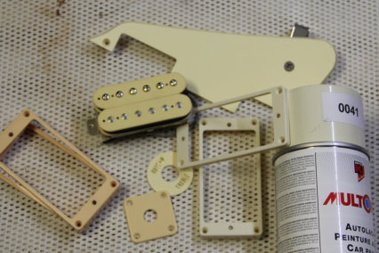 eine Farbe gibt die perfekt dazu passt, werde ich die “’Bobbins” der Pickups sowie die