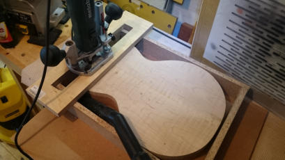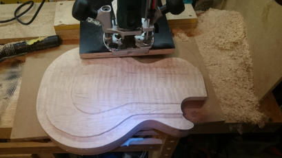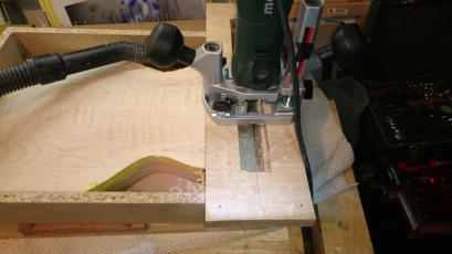 Das Fräsen der Schräge wo später das Griffbrett auf der Decke liegen wird.