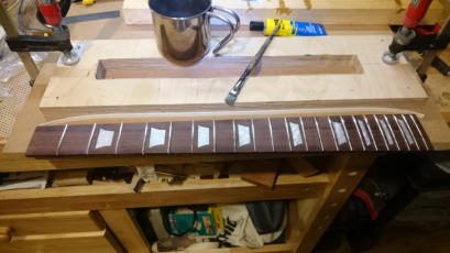 Wie schon geahnt, habe ich mich jetzt dazu entschlossen ein neues Griffbrett zu machen. Da ein Tag nur 24 h hat, habe ich mir ein fertig geschlitztes und mit Einlagen versehenes bei E...ay