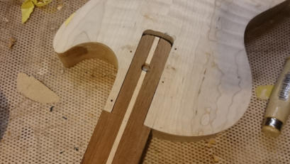 Der Hals passt nun halbwegs rein. Zum Pickup hin ist mir natürlich das Binding