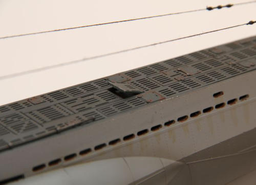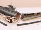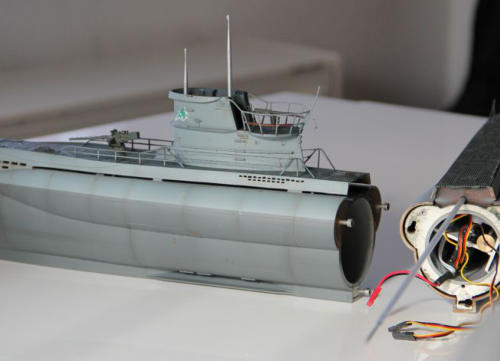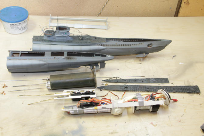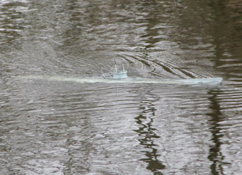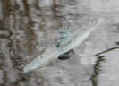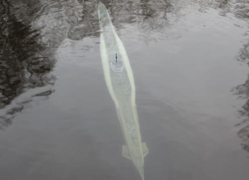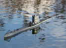 Zwischenzeitlich habe ich das Boot weiter verbessert: •Zur besseren Entlüftung des Oberdecks habe ich im Heckbereich eine weitere Wartungsklappe geöffnet, sowie ganz achtern eine Öffnung geschaffen und das Turmluk geöffnet.•Um das Boot mit leerem Ballastsack weiter aus dem Wasser schauen zu lassen habe ich die schwere Anlenkung des vorderen Tiefenruders durch eine Karbonschubstange ersetzt. •Die sehr lauten und nicht sauber laufenden Antriebswellen habe ich gegen eine Flexwellenanlage getauscht. Im gleichen Zug habe ich die Wellen in Teflon Stefenrohren geführt.Das Boot ist nun dicht und es macht grossen Spass damit zu fahren. Das Fahrgewässer muss aber ziemlich gross sein, denn der Wendekreis ist recht gross.