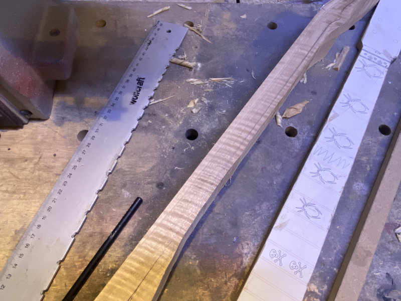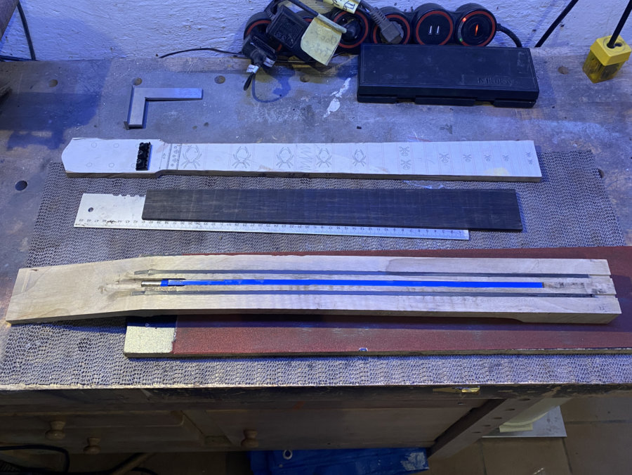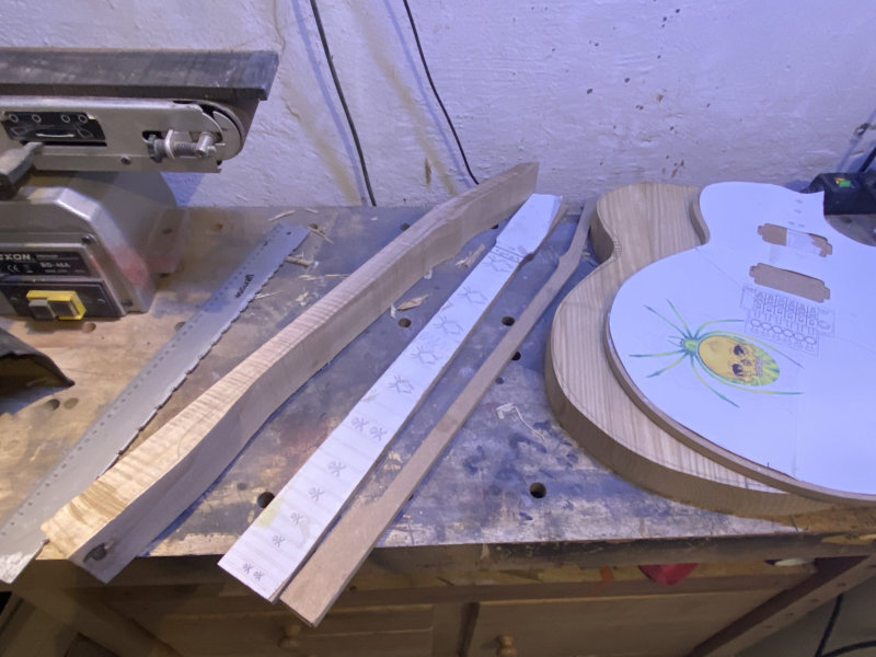 Nun baue ich mir eine Replika davon. Der Korpus wird aus Linde, und der Hals aus Walnuß das ich von Kollege Markus bekommen habe. Das Stück vom Walnußbaum habe ich schon