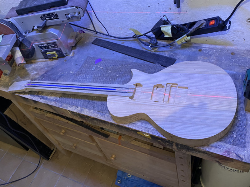 aber durch eine vorrübergehende Verschiebung der Interessenlage, ruhte das Projekt. Bis Jetzt. Es geht weiter! Anfänglich sollte der Korpus die Les Paul Kontur bekommen wie sie Hammett bzw. das