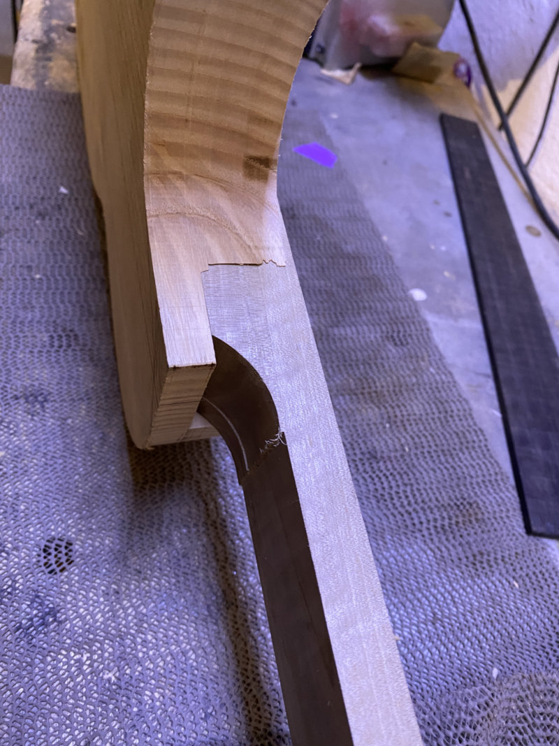 Die Löcher habe ich mit Eichendübeln verschlossen. Leider passt auch die Fräsung nicht so ganz zur Außenkontur des neuen Tremolos. Evtl. werde ich hier